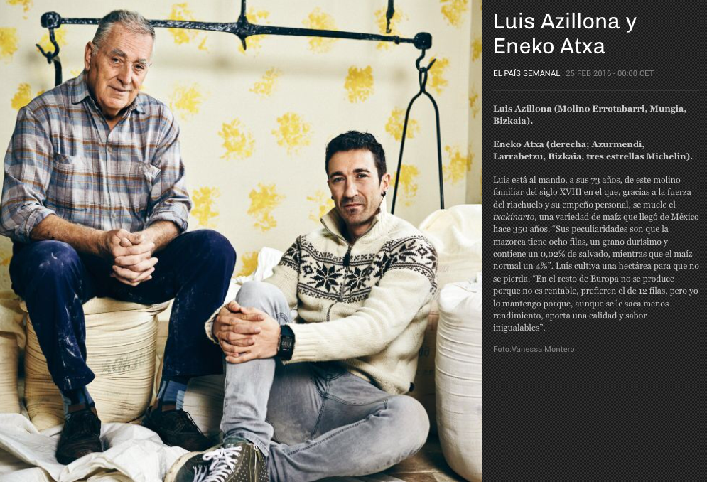 “Ellos son las enciclopedias andantes de nuestra gastronomía”, afirma el chef Eneko Atxa. “Ahora que está tan en boga la sostenibilidad, también incluye ayudar a las personas que conservan el patrimonio de nuestra cultura culinaria. Para lograrlo, hay que crear riqueza en el entorno fomentando que tengan vías de salida y se puedan ganar la vida con ello”, explica Atxa. Y predica con su ejemplo. Al elaborar pan, talos y su homenaje al morokil (papilla de harina de maíz) usa el txakinarto (producto Baluarte Bilbao-Bizkaia Slow), maíz autóctono que proviene del molino familiar de Luis Azillona, a 14 kilómetros de su restaurante y con más de 350 años de existencia. “Conservamos el mismo producto que llegó entonces de México. Pero con esto no te haces rico, solo da la satisfacción de conservar un cereal único, ancestral y excelente”, explica Azillona. “Da mucho trabajo y es difícil que perdure porque el txakinarto es débil. Nuestra variedad no está protegida. Con que alguien plante híbridos a 200 metros de mi huerto, podría contaminarlo a través del polen, por el aire, y acabar fácilmente con él”.