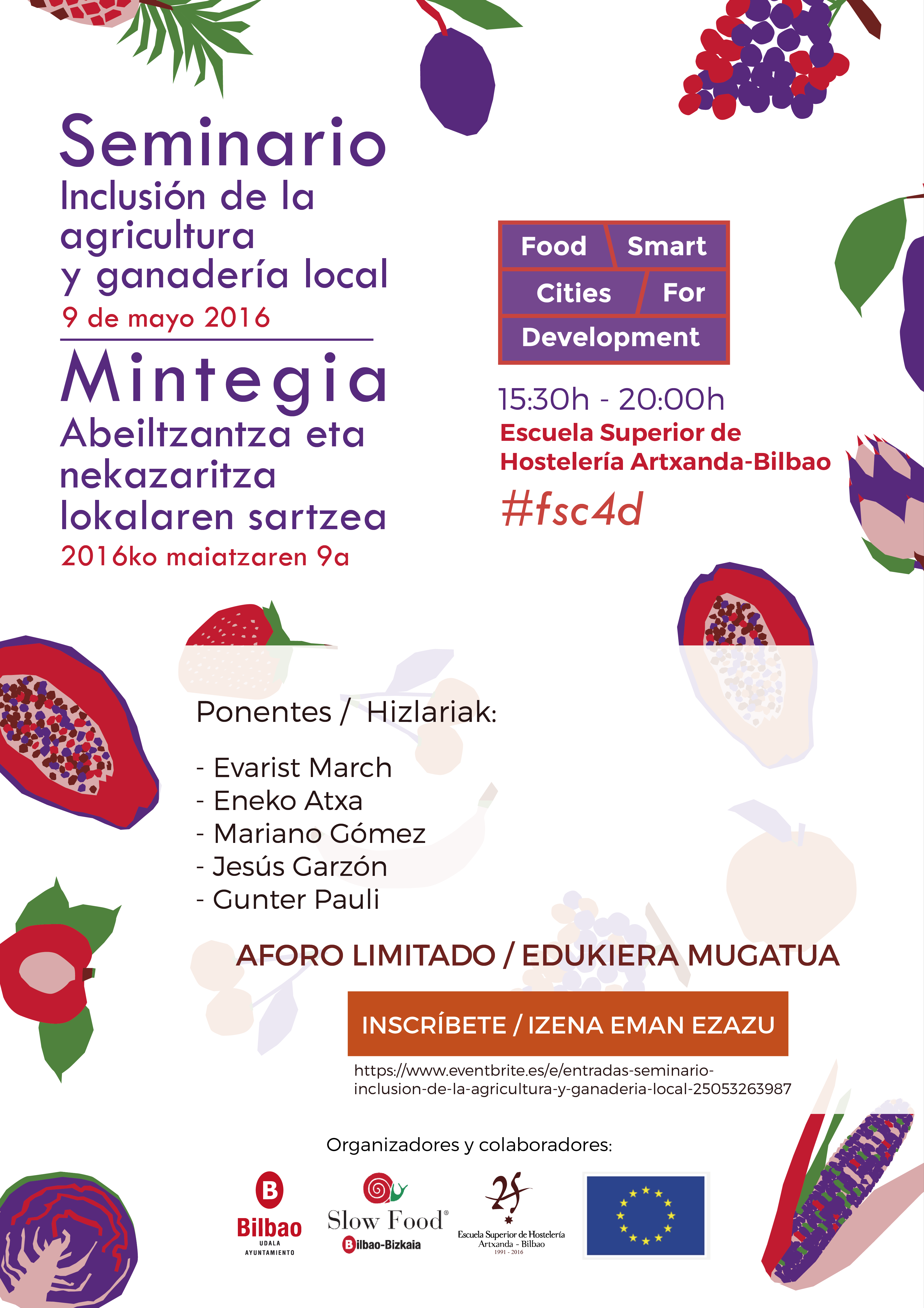 El próximo lunes, 9 de de mayo tendrá lugar en la Escuela Superior de Hostelería Artxanda- Bilbao una jornada sobre la “Inclusión de la agricultura y ganadería local”. El evento se enmarca dentro del proyecto europeo Food Smart Cities for Development que desarrolla el Ayuntamiento de Bilbao (Área de Igualdad, Cooperación, Convivencia y Fiestas) con Slow Food Bilbao-Bizkaia.