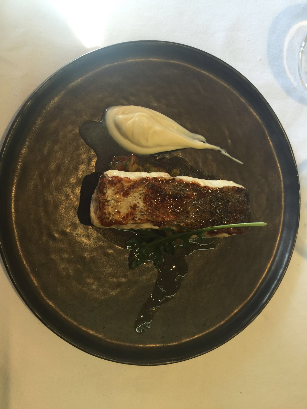 Merluza a la plancha sobre falso risotto de trigueros y emulsión de coliflor.
