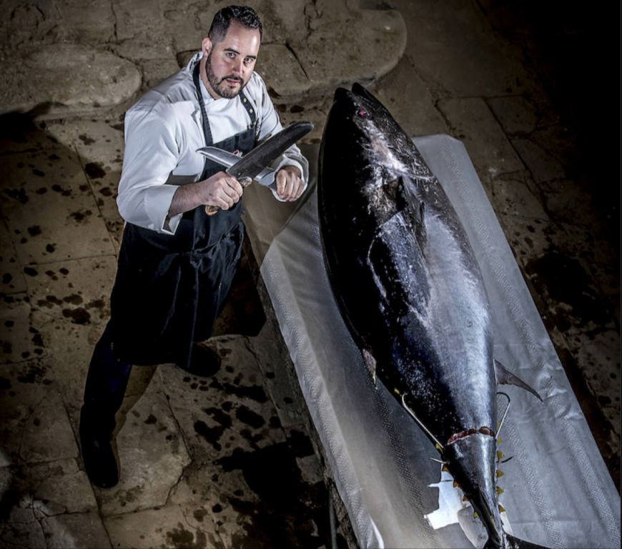 Es único en su especie, una excepción, el primer ejemplar de atún rojo capturado en el Mar Balear que acaba su existencia en tierras carranzanas, entre verdes valles y vacas frisonas y monchinas. Su existencia salvaje, de nadador imparable y voraz, terminará en el fondo de un plato tras ser despiezado por las manos expertas del cocinero Txema Llamosas (Bilbao-Bizkaia Slow), un tiarrón de 30 años y manos como tenazas que trabaja en Casa Garras (restaurante km.0). El gigante medía 2,01 metros y pesó 175 kilos tras ser sacrificado con un tiro de posta en la frente mientras nadaba en una granja marina de la empresa Balfegó, en L»Ametlla de Mar. Cayó a plomo, fulminado por el disparo de un buzo el pasado día 17. Una vez muerto, fue izado hasta una barcaza, eviscerado, analizado y preparado para ser transportado en pocas horas hasta Euskadi. Allí se convertiría en el protagonista de una ceremonia singular, una muestra de respeto y oficio hacia una criatura maravillosa, repleta de vida y bocados singulares.